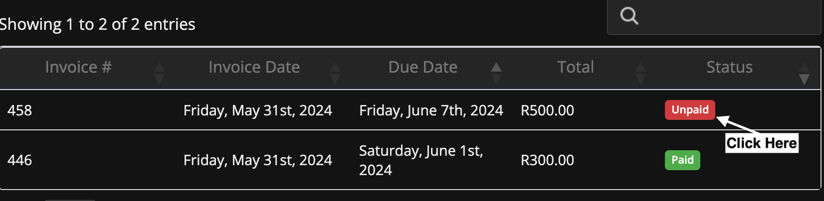 Once you click on the Invoices Icon you will see a list of invoices including Unpaid Invoices. Click on the unpaid invoice